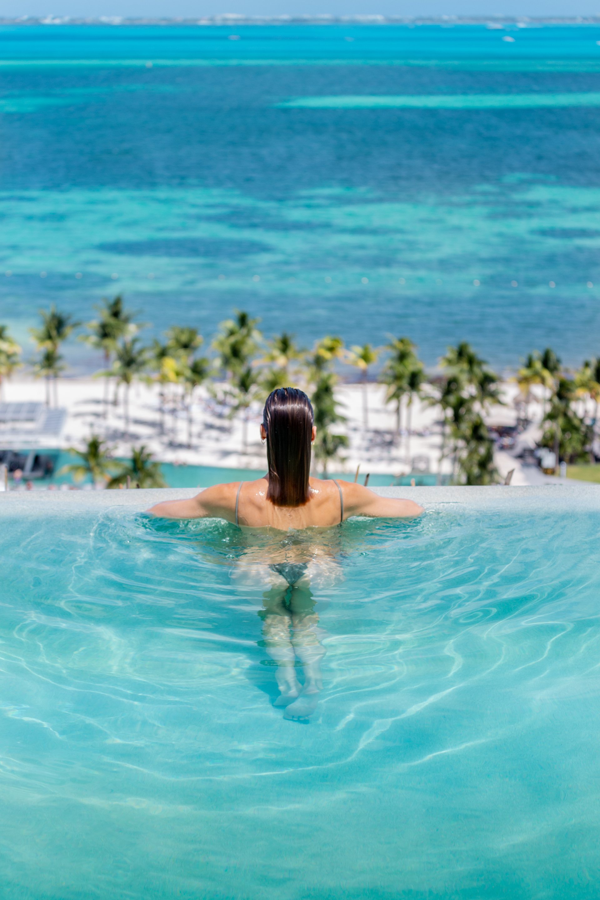 Guests relaxing by the infinity pool at a luxury beachfront resort, surrounded by palm trees and overlooking the Caribbean Sea.